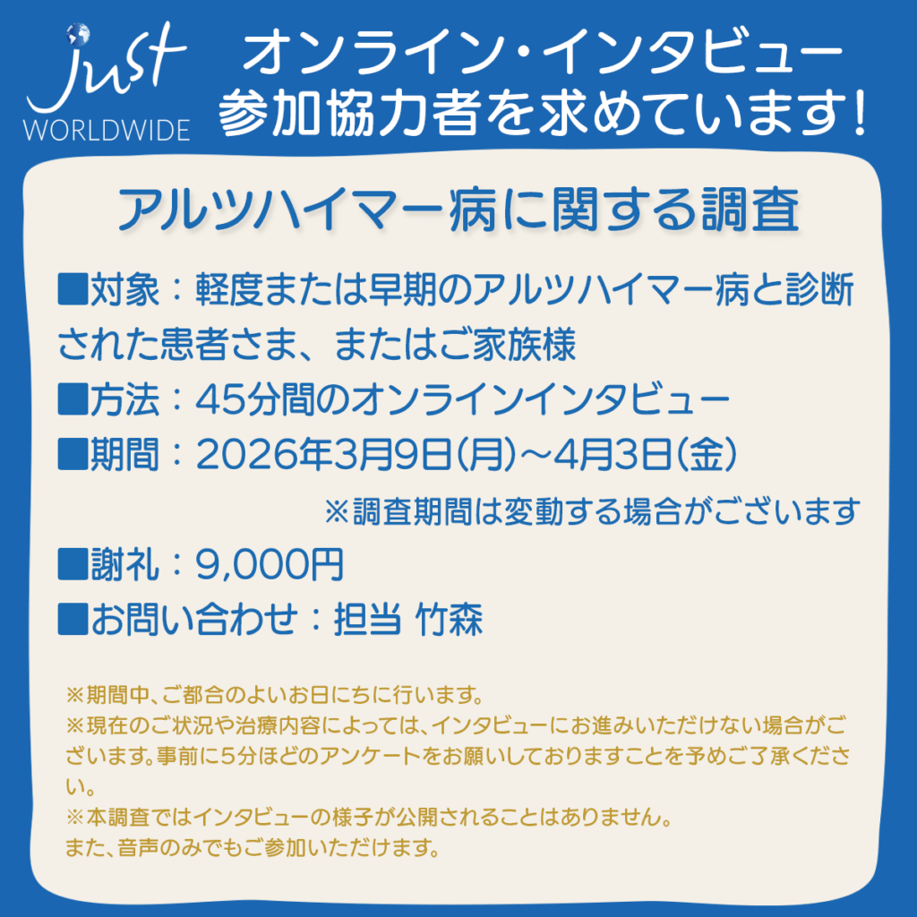 #アルツハイマー #軽度 #早期 #オンラインインタビュー #調査 #治療 #患者 #家族 #謝礼 #ZOOM #MCI