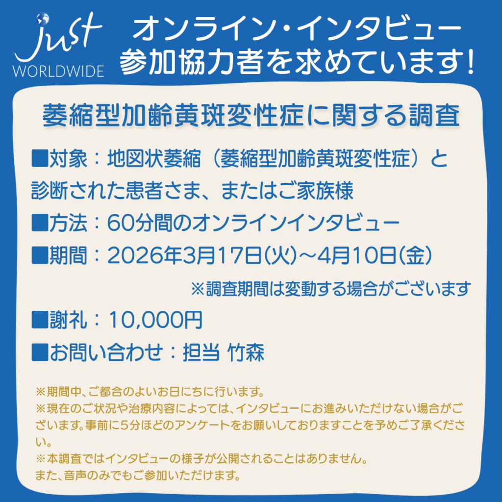 #萎縮型加齢黄斑変性症 #地図状萎縮 #オンラインインタビュー #調査 #治療 #患者 #家族 #謝礼 #ZOOM