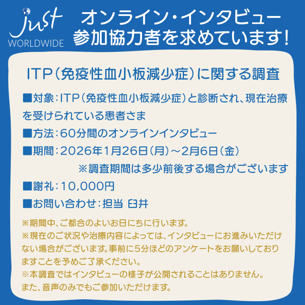 #ITP #免疫性血小板減少症 #オンラインインタビュー #調査 #治療 #患者 #謝礼 #ZOOM